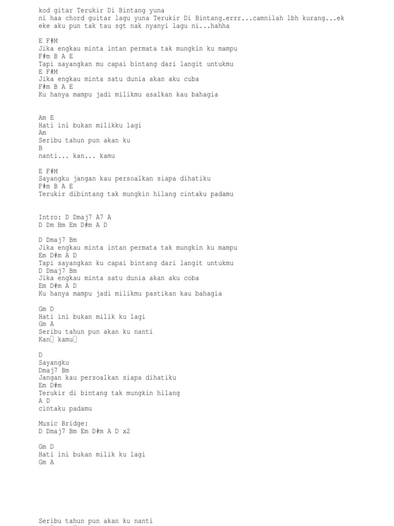D Sayangku Dmaj7 Bm Jangan kau persoalkan siapa dihatiku Em Dm Terukir di bintang tak mungkin hilang A D cintaku padamu 2x Em Dm Terukir di bintang tak mungkin hilang A D cintaku padamu. E Jika engkau minta intan permata Fm tak mungkin ku mampu Fm B Tapi sayang kan ku capai bintang Fm B E dari langit untukmu E Jika engkau minta satu dunia Fm akan aku coba Fm B Ku ha. Chord Kunci Gitar dan Lirik Lagu Terukir di Bintang - Yuna Chord Mudah Dimainkan Berikut ini Chord Kunci Gitar dan Lirik Lagu Terukir di Bintang - Yuna.